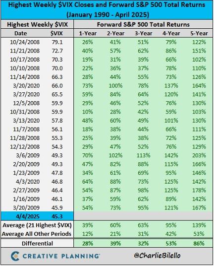 We will leave you with one final note: last week’s VIX reading ranked among the top 20 highest since 1990. The VIX measures market volatility—how “nervous” investors are. You don’t need to understand the mechanics, just this: historically, when volatility has spiked to this level and held for a full week, forward returns have been some of the strongest on record. Makes sense when you think big picture.